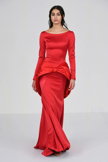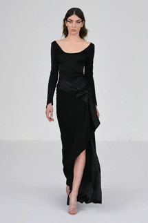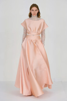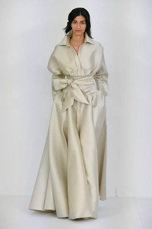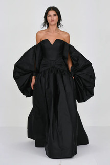 Mabille used crêpe and satin to create voluminous layers, delicate lace accents, and ballooning puff sleeves. The restrained color palette was balanced with a variety of embellishments, such as all-over tone-on-tone embroideries, sequins, ostrich feathers, and giant bow details.