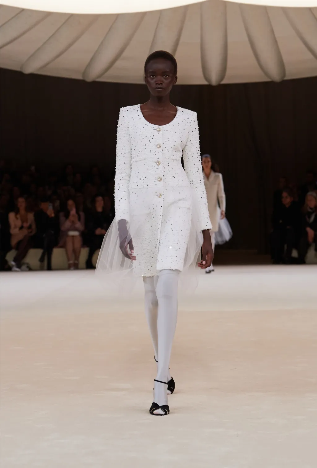 The iconic tweed blazer was reimagined with a lightweight frothy layer of tulle, with sequin camellias punctuating blazers. The wedding frock was a mini dress with big tulle sleeves and a flowing cape behind it, a welcome embrace of couture clothing injected with personality. The collection was a delicious exploration of texture, combining layers of tulle over tweed to create a sense of girlhood and womanhood intersecting in fashion.