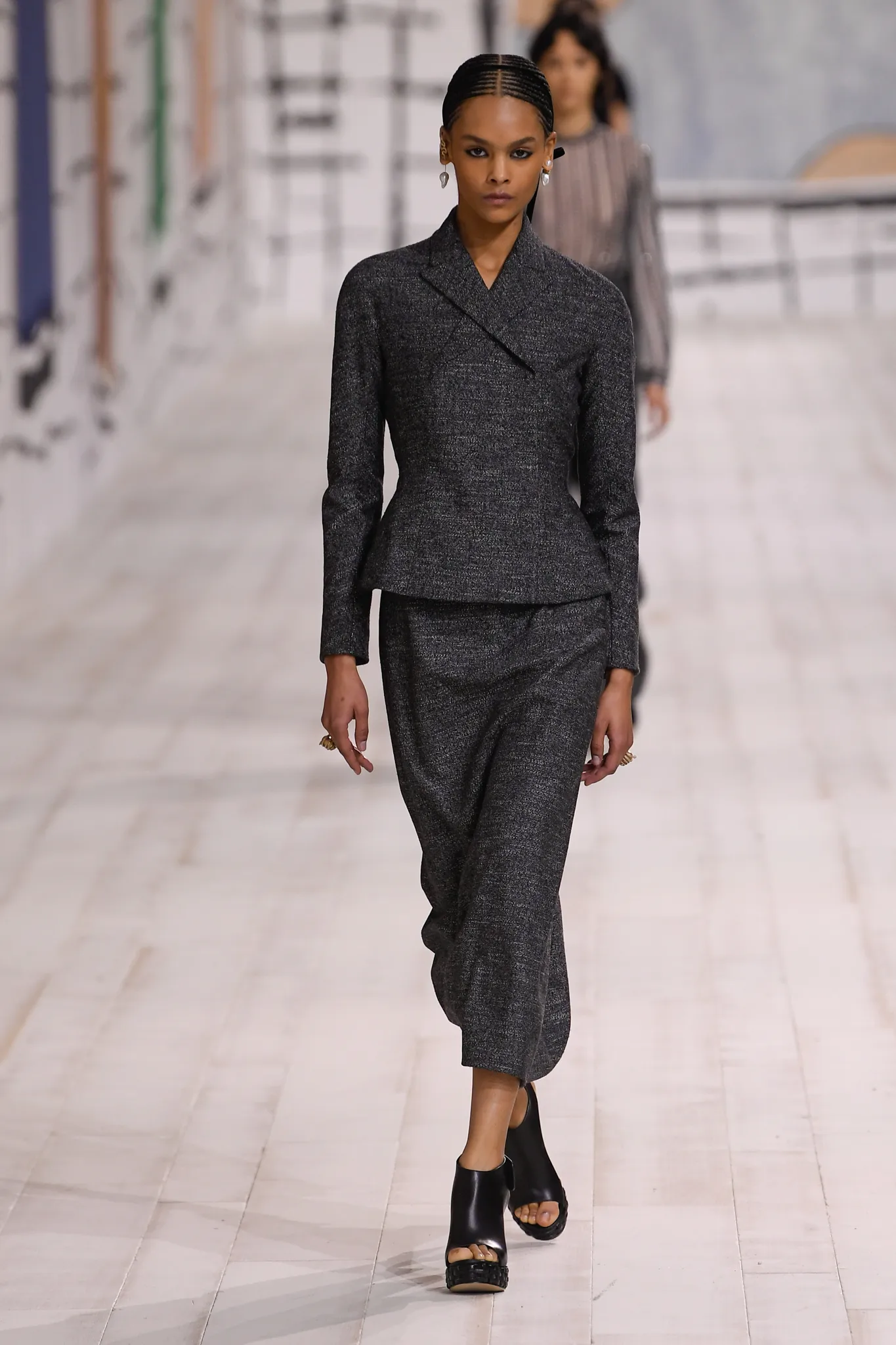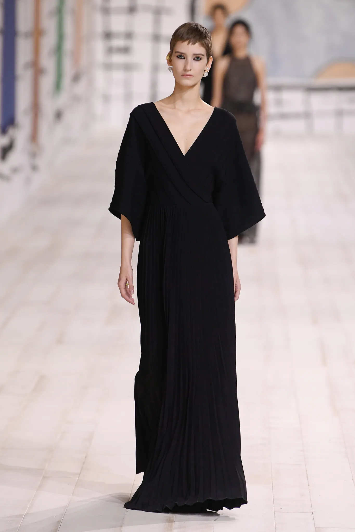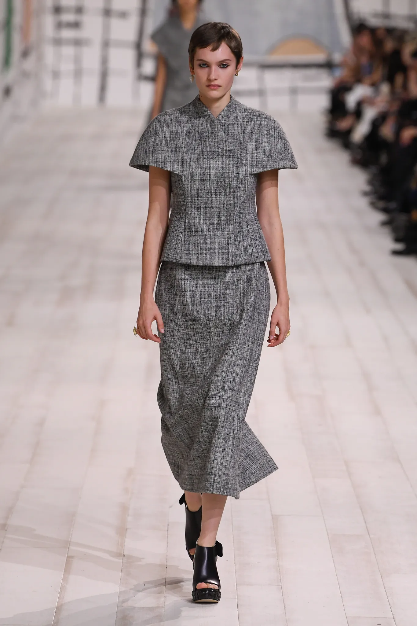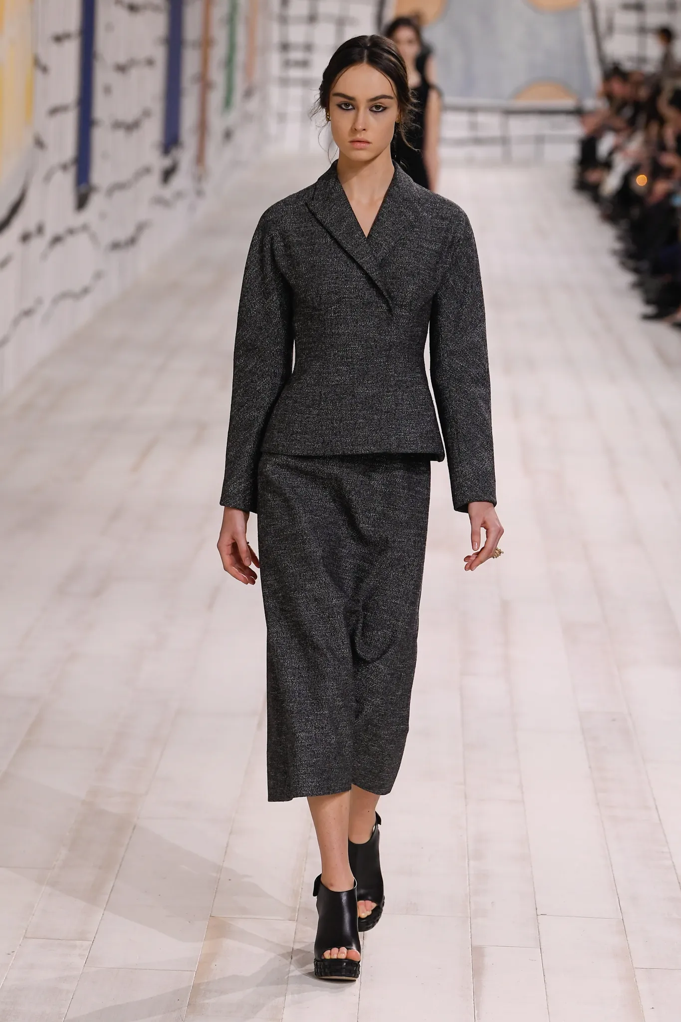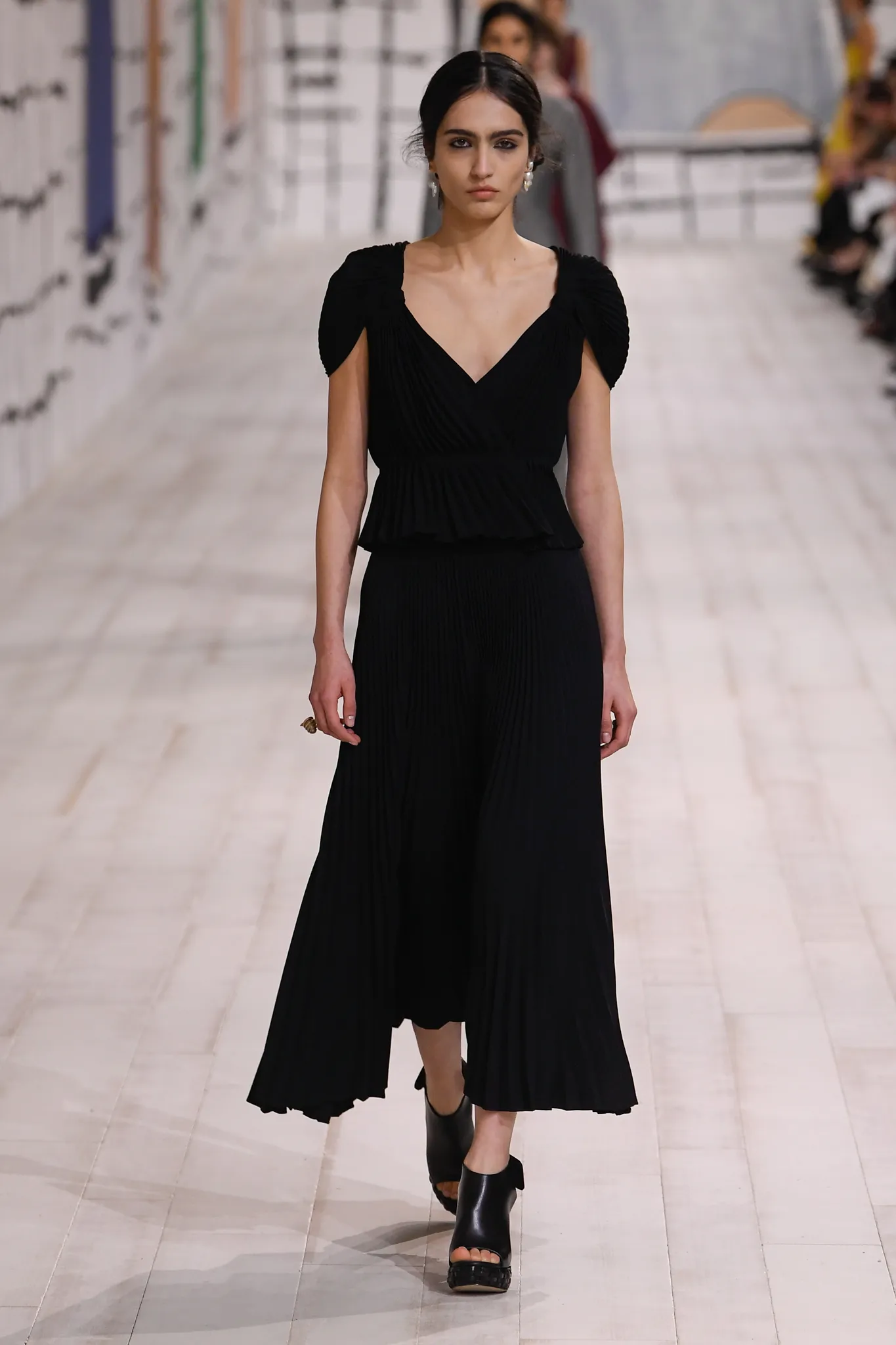 The collection also features checked gray wool skirt suits and minimal, inky black velvet evening dresses. Chiuri pointed out how pleating was used to shape one of her signature white Grecian goddess gowns, which can only be done in couture on the body of the client.