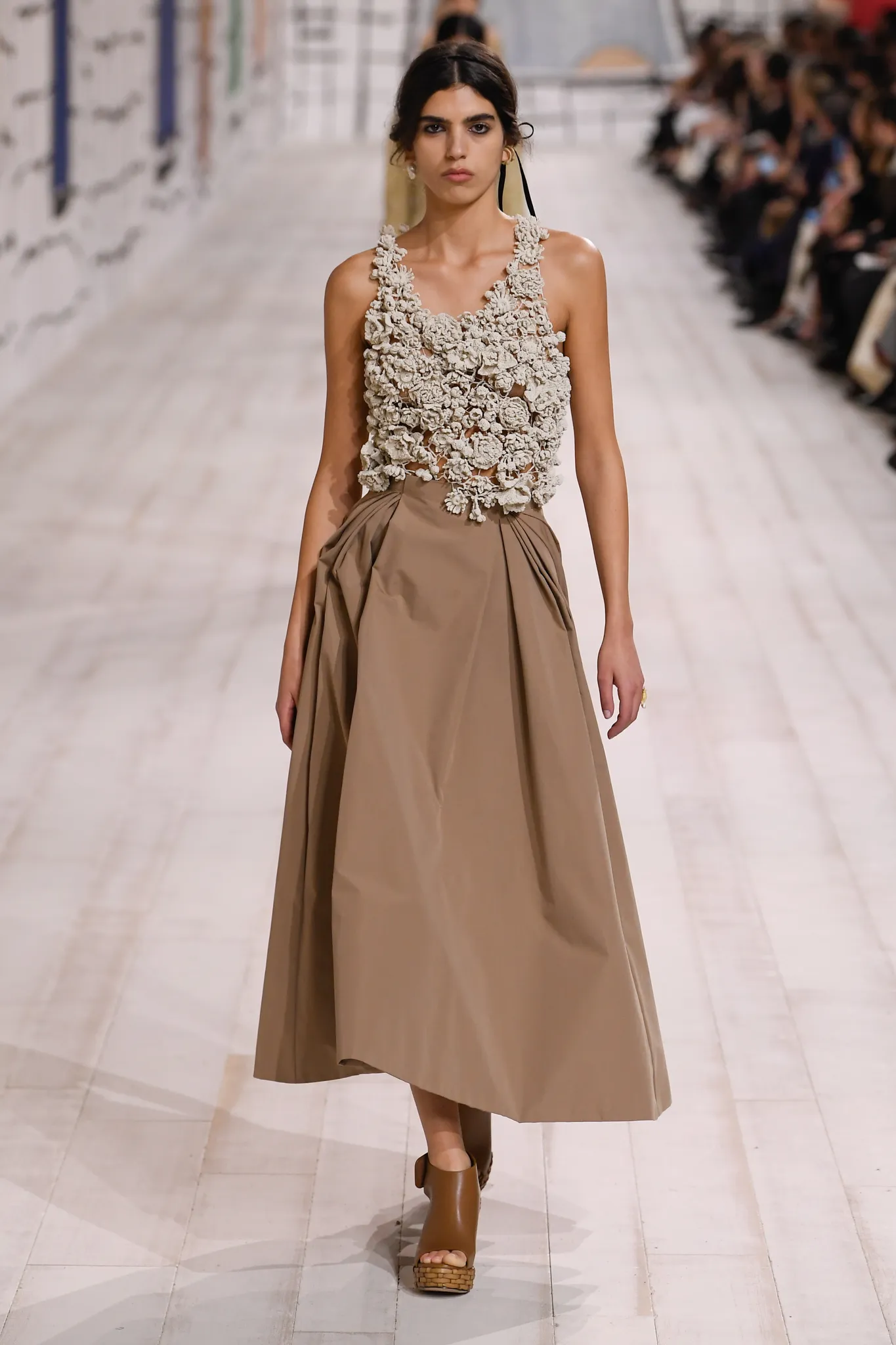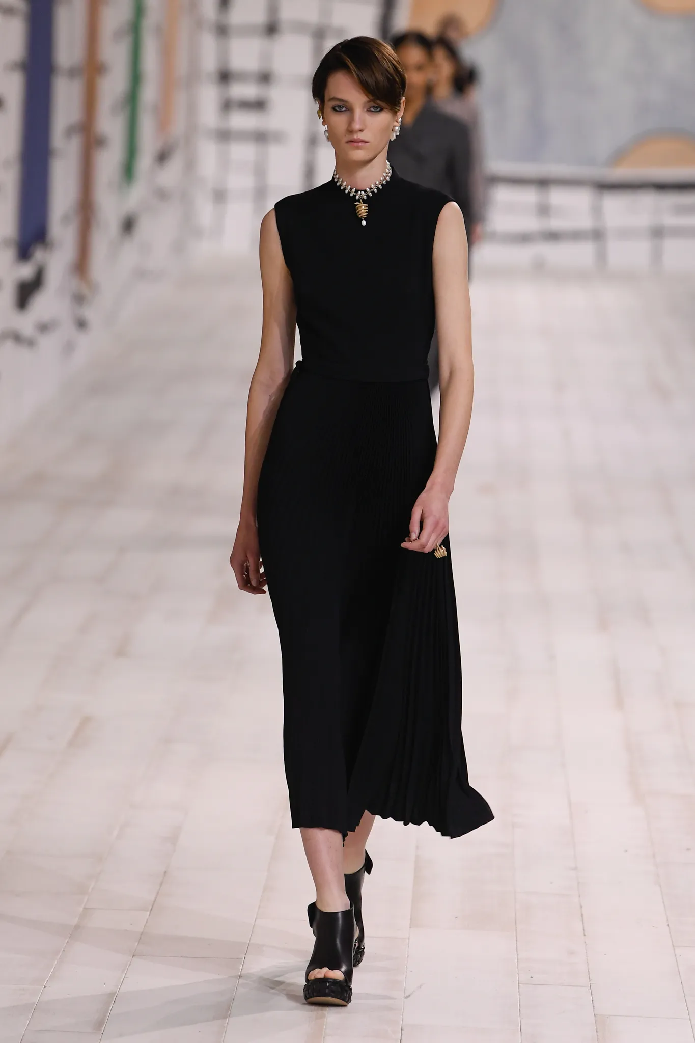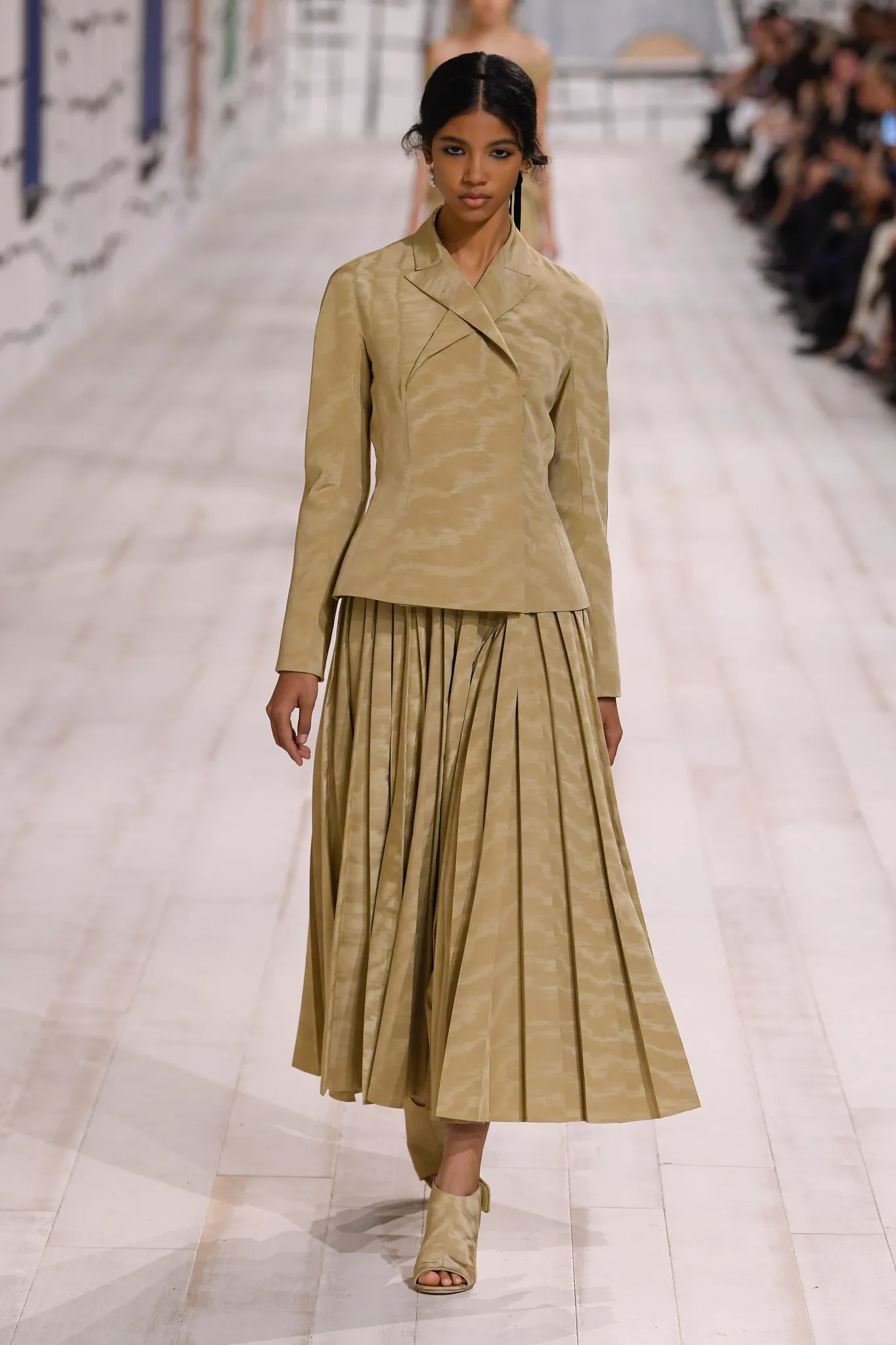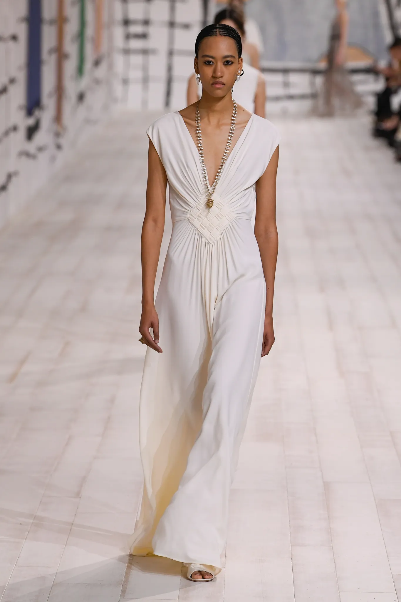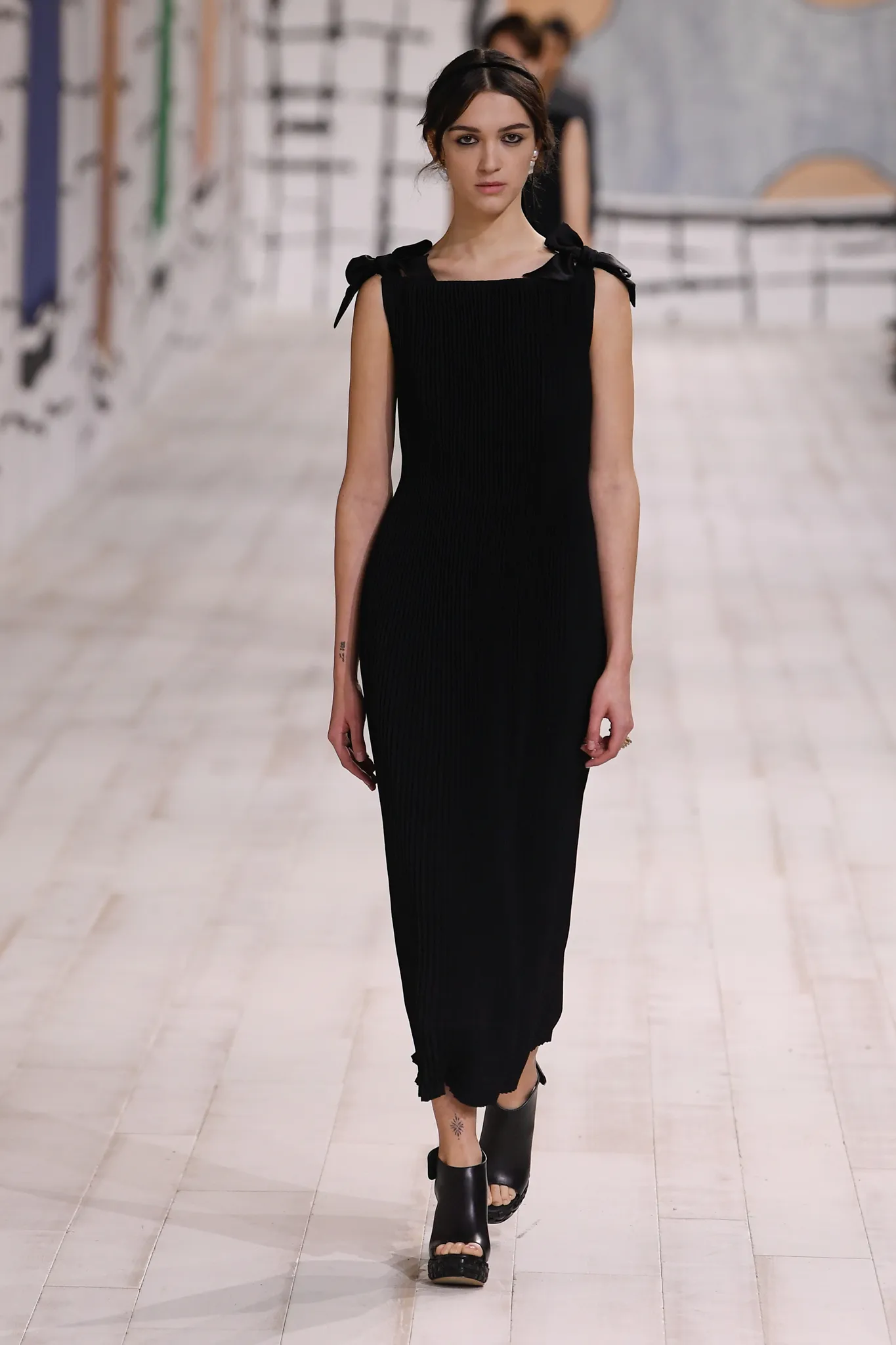 The collection also features checked gray wool skirt suits and minimal, inky black velvet evening dresses. Chiuri pointed out how pleating was used to shape one of her signature white Grecian goddess gowns, which can only be done in couture on the body of the client.