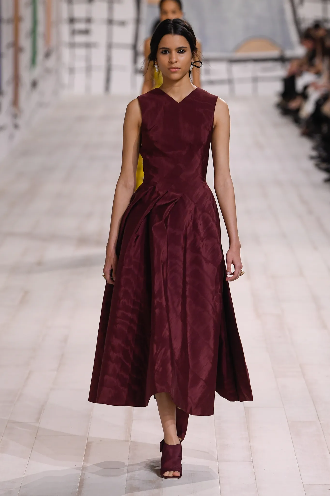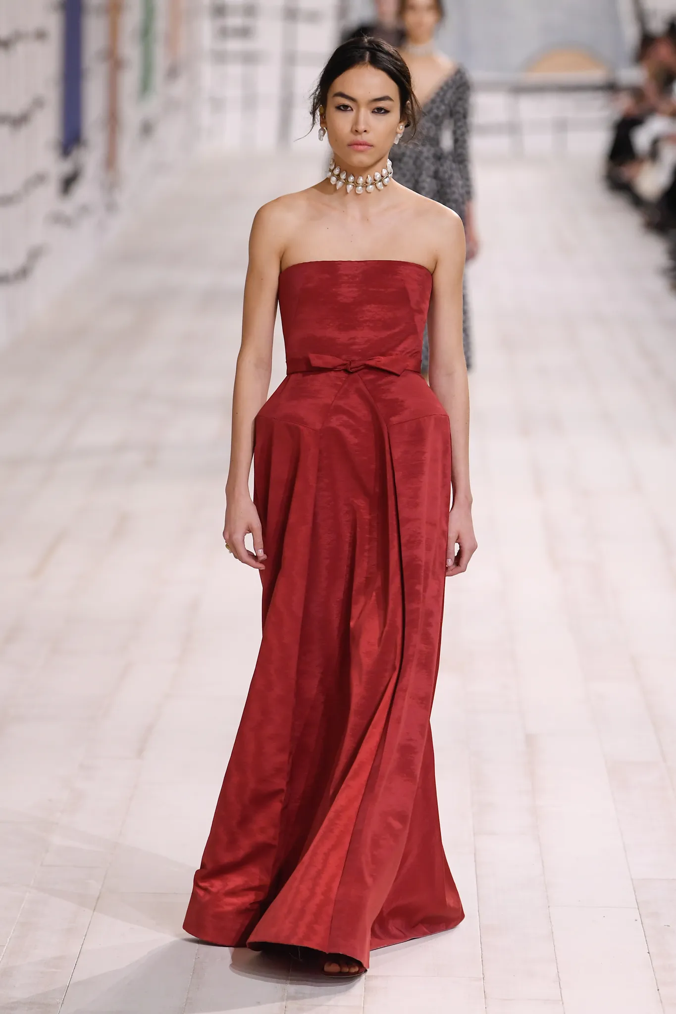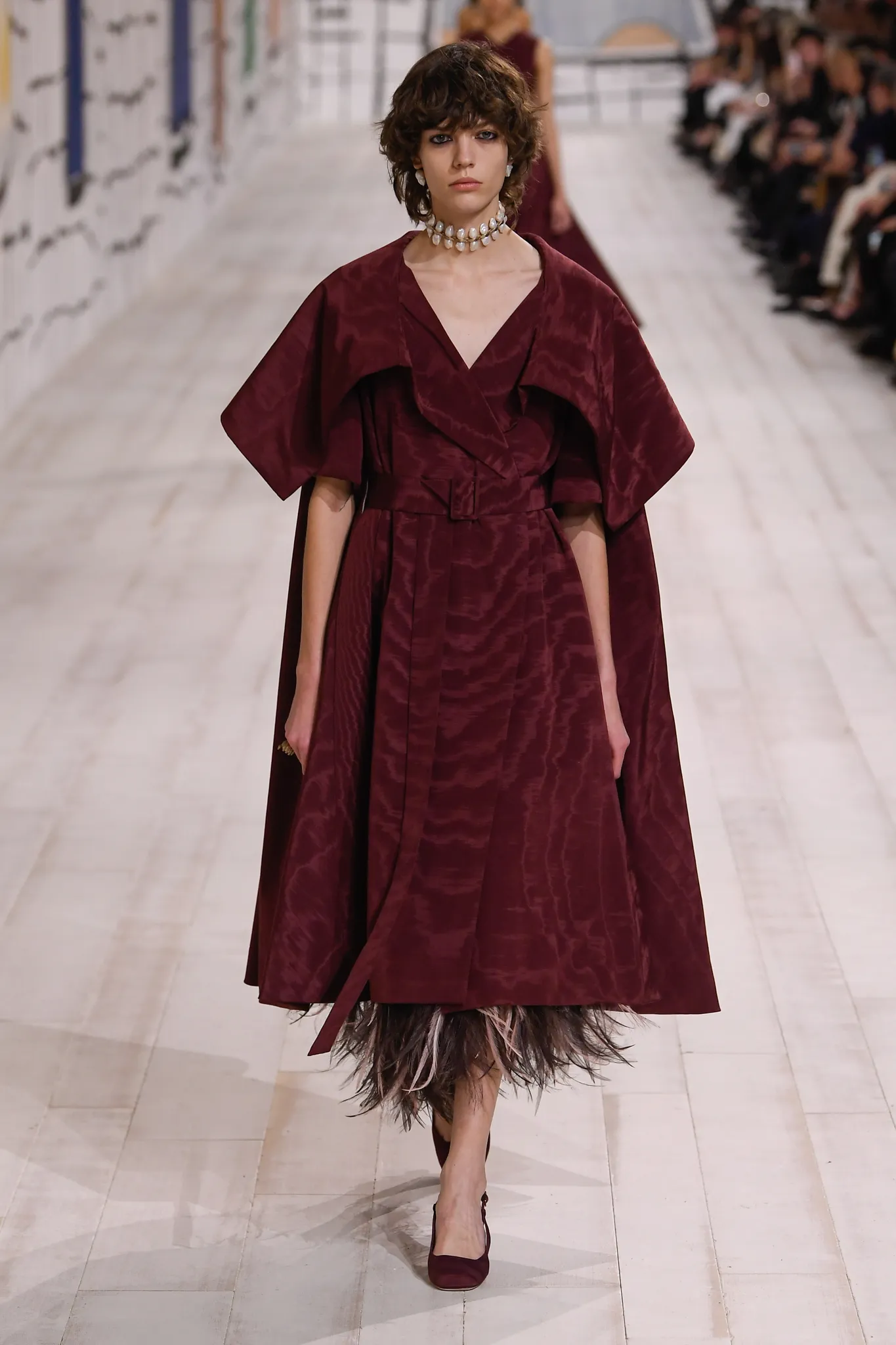 To make the material relevant to a modern clientele, Chiuri worked with a supplier near the silk capital of Lyon to produce a lighter version of the fabric. The collection features a range of items, from jackets, coats, and pants to evening gowns. Chiuri sculpted the exaggerated hipline of the Cigale dress into a ruby red bustier gown but also tamed the unwieldy material into a sensual drape on the neckline of a trench-inspired dress.
