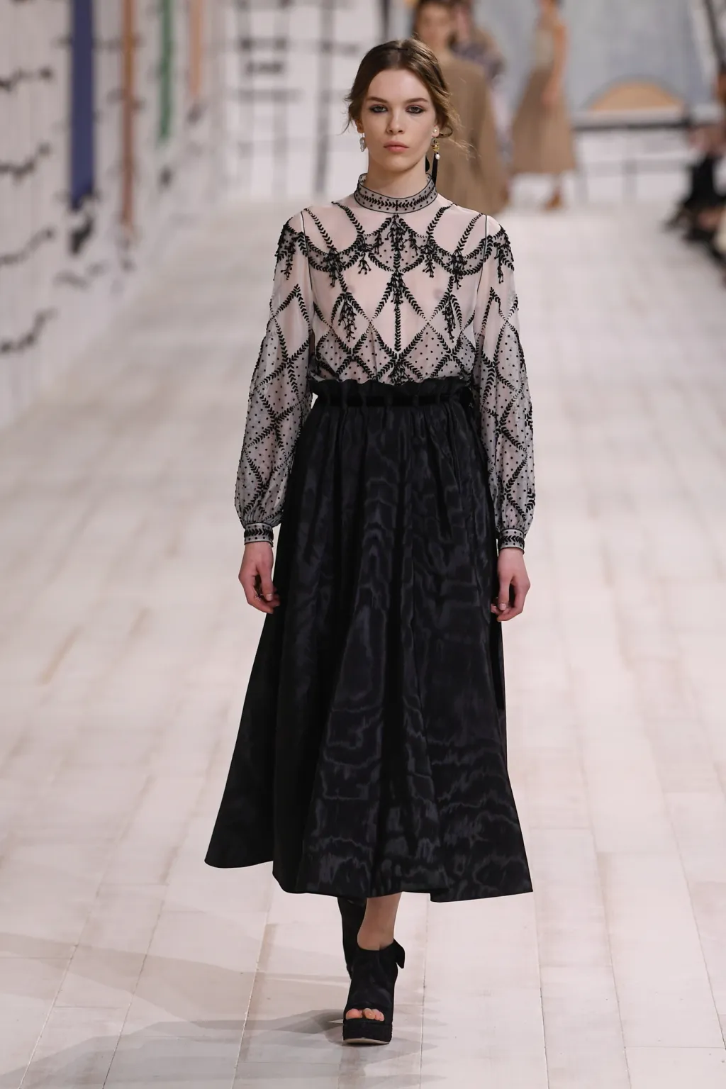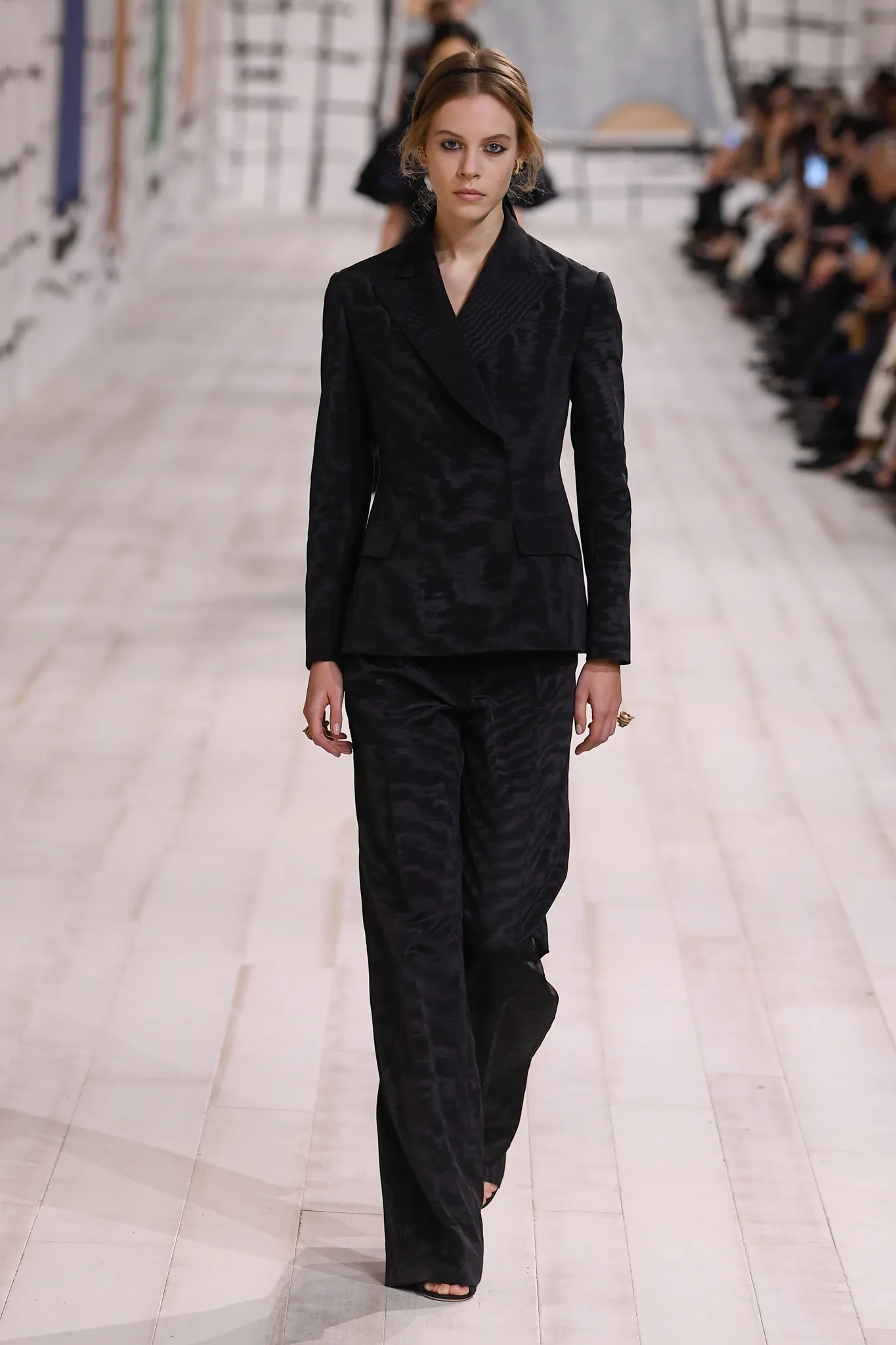 The moiré trend has already found an early adopter in Rihanna, who wore a shawl-collared black belted jacket and pencil skirt with a matching baseball cap to the show. Moiré, also known as watered silk, is a wavy fabric prized historically as a symbol of sovereignty.