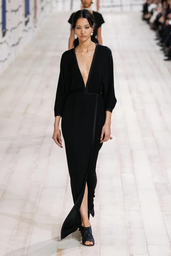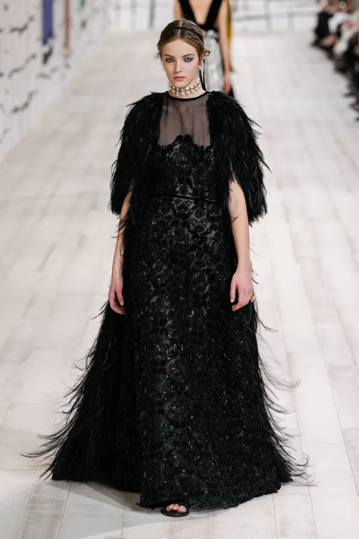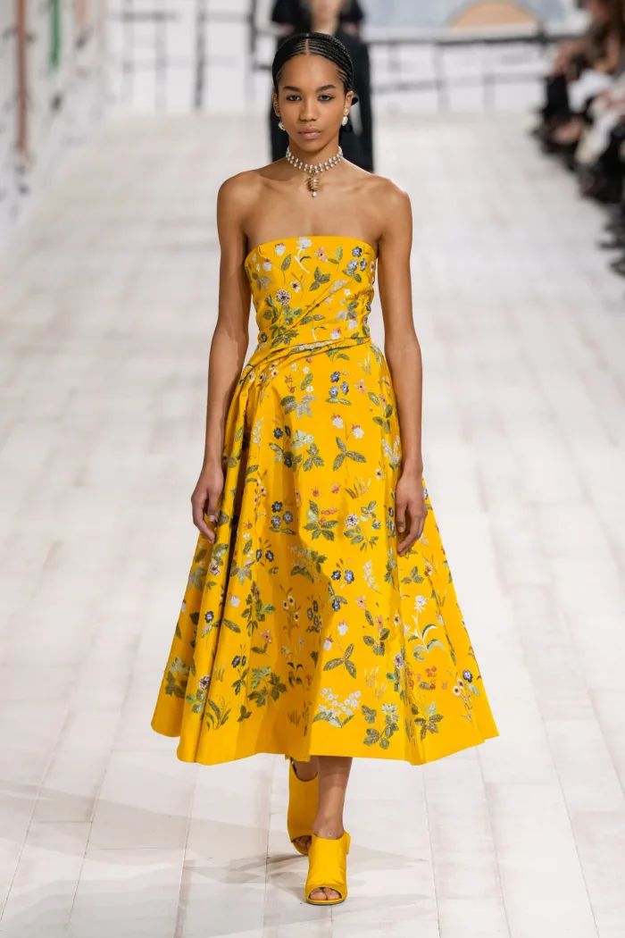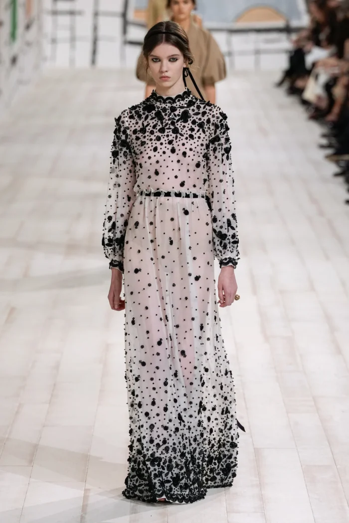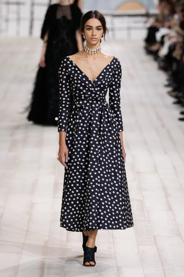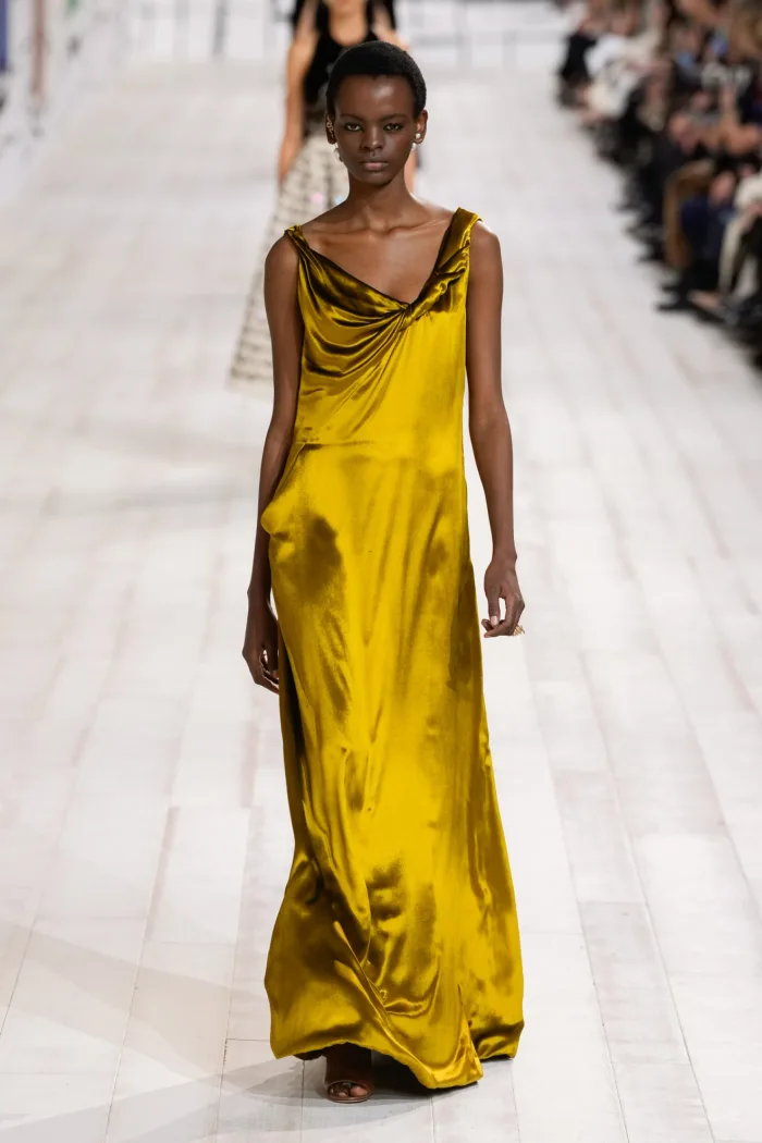 The collection's core pieces prioritize wearability over fantasy, while still having a couture attitude. The vintage and innocent edge of the playful opening ode to "Poor Things" is apparent in some pieces, such as billowing floor-length polka-dot dresses and a very Victorian-looking black gown with feathered arms. A slinky mustard yellow slip dress that was twisted at the neckline also plays with the delicate balance between girlhood, womanhood, and the fashion industry's expectations.
