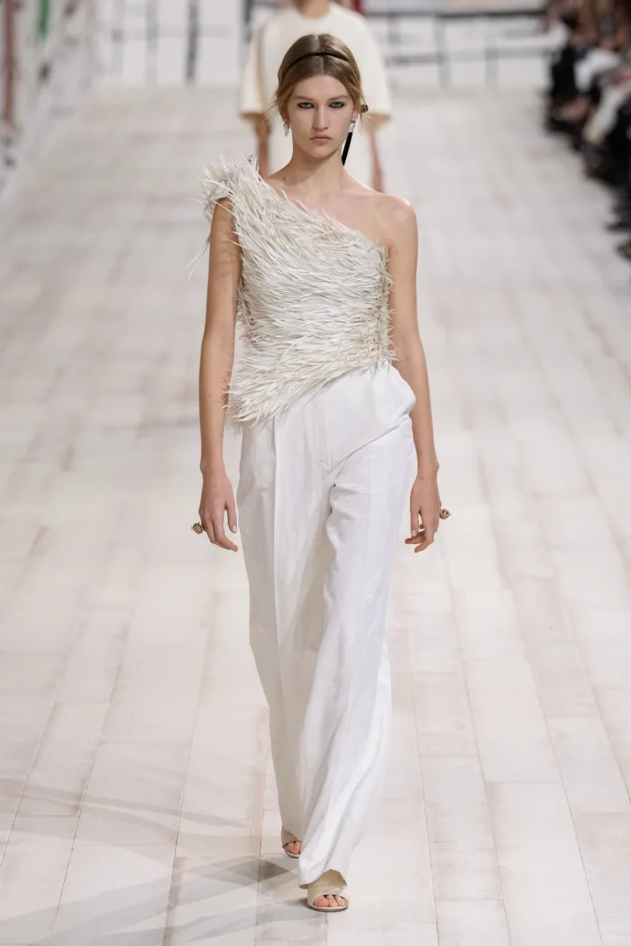 The pieces are a mix of high fashion with couture flourishes and everyday, mundane clothing. Notable pieces include textural wonders of feather details, little tailored suits, black pleated dresses, and sheer beaded skirts worn with wool pants. Regardless of their extravagance, the clothes maintain an everyday appeal.