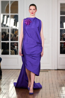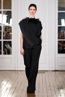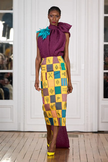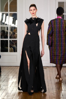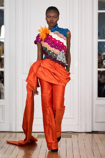 Ayissi, who was born in Cameroon, is known for combining traditional dress fabrics with ancestral crafts from across Africa. In this collection, he seamlessly blended the two, using a range of materials in black and vivid jewel tones to create tone-on-tone layered silhouettes. Wide pants and pencil skirts served as a backdrop for dramatic offset bodices with train and bow details while draping added voluminous peplums and bustles to highlight the waist or hips.