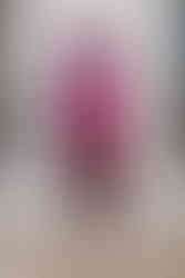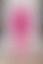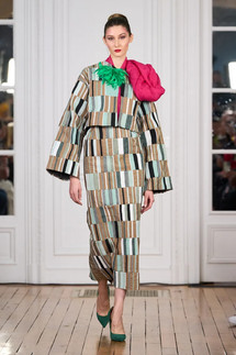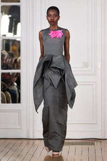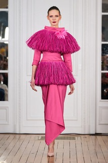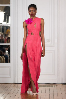 Raffia, another of Ayissi's signatures, made a powerful impact in the collection. It formed a cape and skirt on one vivid fuchsia number, or graphic bow-like bundles spliced across the front of a scarlet minidress. Additionally, he adorned his bodices with circles of fabric centered by buttons, a signature he began experimenting with a few seasons ago, or with 3D appliqué flowers made with tree bark.