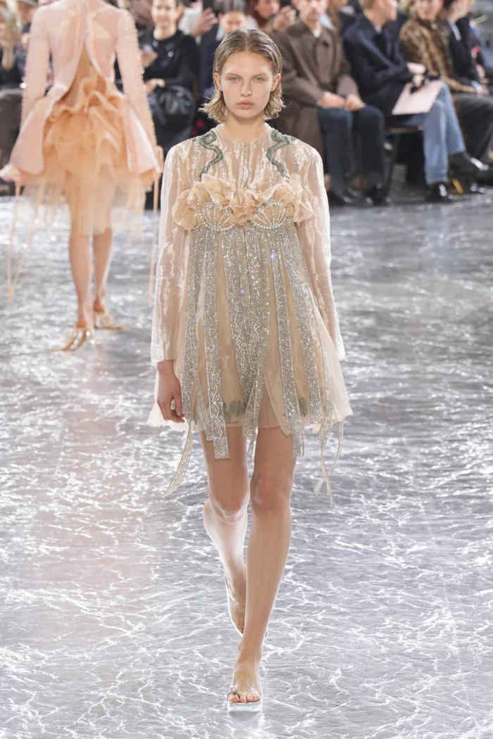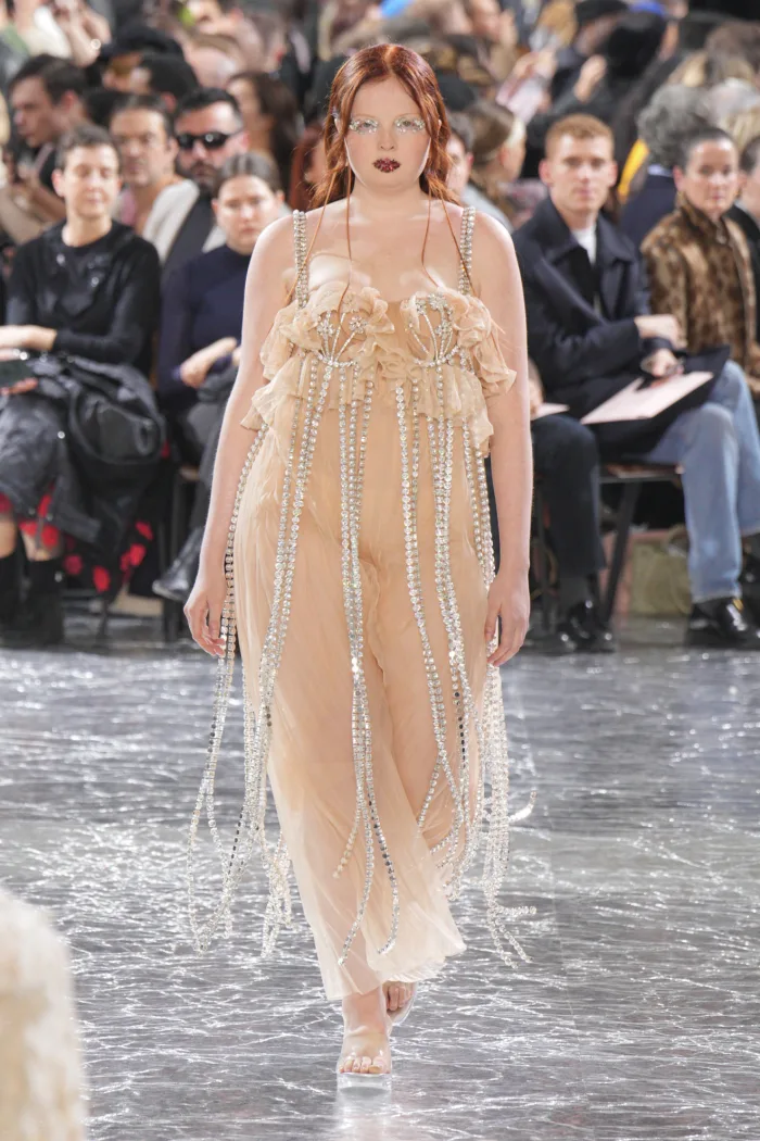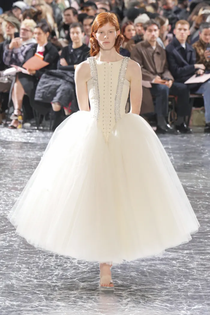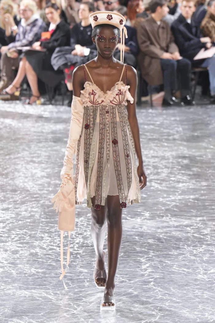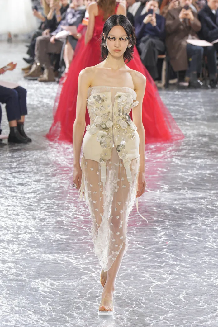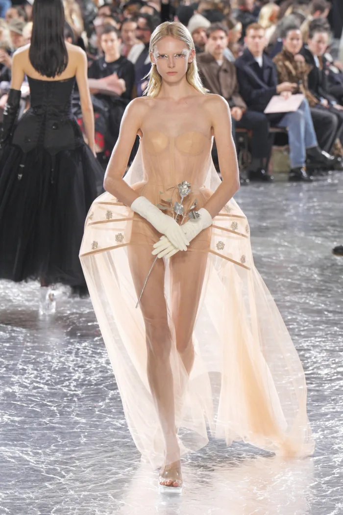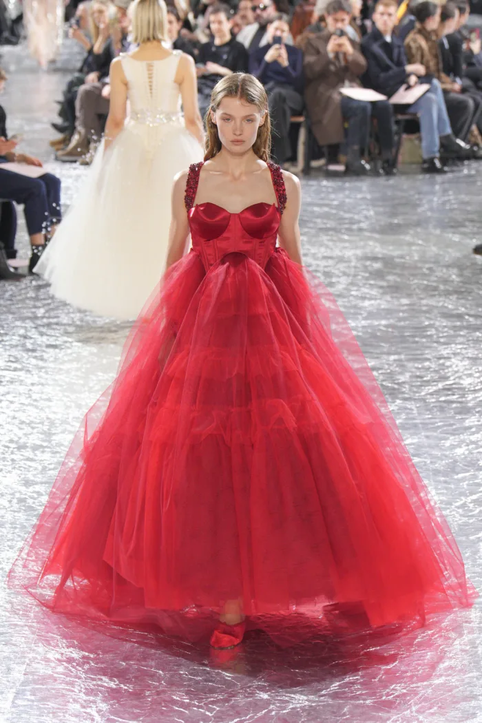 The collaboration between Jean Paul Gaultier and Simone Rocha has introduced a new model for haute couture shows. Each piece is a treasure trove of motifs culled from the archives and reinterpretations of iconic designs. Rocha has reimagined Jean Paul Gaultier's corsetry with lacing elements that are tied more loosely and included nautical elements such as rhinestone shells and sailor hats dotted with red rhinestone florals. The collection also features Simone Rocha's recognizable design language, with a pronounced edge and hardness compared to the ready-to-wear line.