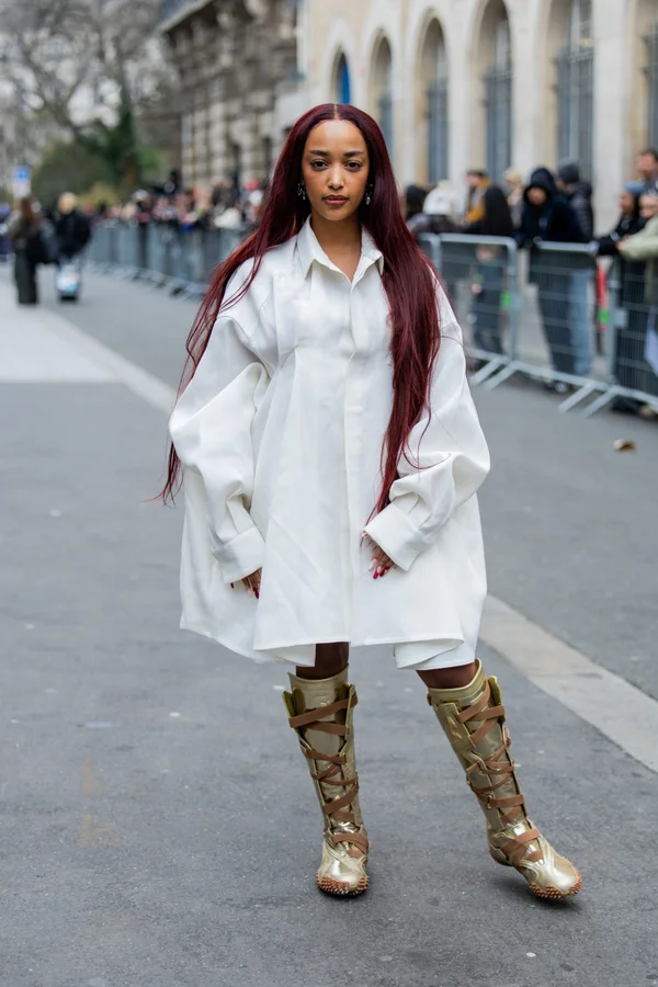 Sneaker designer Salehe Bembury made a statement in a purple puffer coat and bright yellow bag, adding camouflage pants to the mix. Meanwhile, rapper Pusha T kept it simple with a matching tan sweatsuit and jacket, complemented by his unreleased yellow Adidas sneakers. Art gallerist Hannah Traore's ensemble featured a bomber jacket, paneled skirt, and a white shirt.